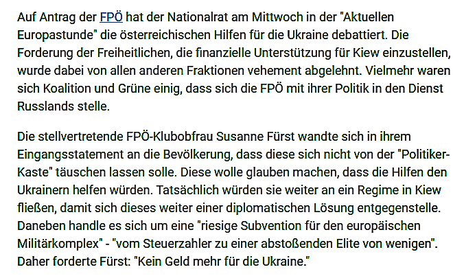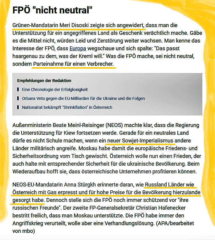 Letzteres möchte ich eigentlich ausschließen. So dumm sind unsere Volksvertreter wieder nicht. Nur sind sie wirklich in Zeitgeschichte so unbewandert oder was bringt sie dazu, dass sie entscheidende Fakten einfach wegwischen? Diese parlamentarische Debatte war geprägt von den inzwischen schon abgelutschten üblichen Klischees: Wer Kritik übt, sei ein Agent Putins, sei der russischen Propaganda verfallen, habe jedes moralische Maß verloren. Es sei ein Kampf der Guten gegen das Böse. Es gehe um die Eindämmung der imperalistischen Gelüste einer Großmacht. Wer was anderes glaube, lebe am Mond. Die FPÖ würde nicht neutral sein sondern nehme Partei für einen Verbrecher. Es sei Russland gewesen, das Österreich mit Gas erpresst habe und an den hohen Preisen schuld sei.