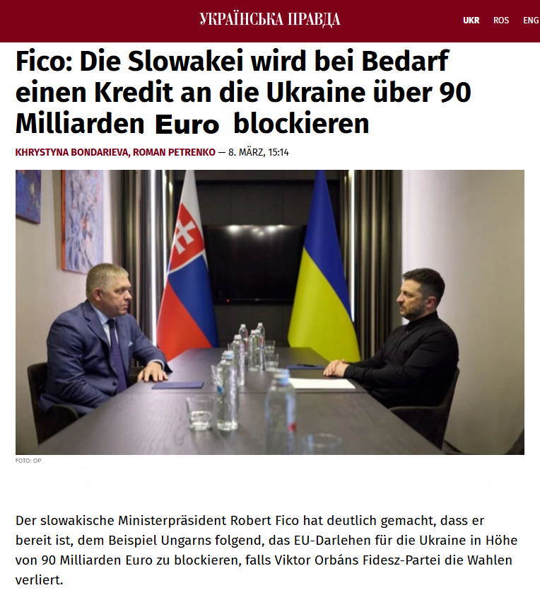 Dazu die "Ukrainische Wahrheit" >> Fico sagte, dass er bei einem zukünftigen Treffen mit dem Präsidenten der Europäischen Kommission plant, die Stilllegung der Druzhba-Ölpipeline zu besprechen. Er sagte, er werde die Dienste der Slowakei anbieten, falls es notwendig sei, die Pipeline in der Ukraine "irgendwie anzuziehen". "Aber die wichtigste Botschaft wird sein, dass die Slowakei bereit ist, den Stab von Ungarn zu übernehmen, falls nötig", sagte Fico. Er erinnerte daran, dass derzeit das Kredit der Europäischen Union an die Ukraine in Höhe von 90 Milliarden Euro tatsächlich blockiert ist. "Aber ich bin nicht naiv. Der ukrainische Präsident hat kürzlich darüber gesprochen, die Lieferungen in anderthalb Monaten wieder aufzunehmen. Das heißt nach den Wahlen in Ungarn, wo er auf den Sieg der Opposition zählt. Dann gibt es keine Chance mehr auf Öl aus dem Osten. Es sei denn, jemand anderes übernimmt den Stab Ungarns", sagte Fico und deutete an, dass die Slowakei es schaffen könnte. Die Wahlen in Ungarn finden am 12. April statt. Er fügte hinzu, dass die Blockierung dieses "riesigen militärischen Geschenks" an die Ukraine ein legitimes Mittel zur Wiederherstellung der Öllieferungen sei. "Jedenfalls ist jetzt die Europäische Union an der Reihe", fügte Fico hinzu. Am 6. März bestätigte die Europäische Kommission, dass Fico um ein Treffen mit Präsidentin Ursula von der Leyen gebeten hatte. Fico erklärte außerdem, dass er eine Position mit der Europäischen Kommission zur Druzhba-Ölpipeline koordinieren möchte, bevor er sich mit dem ukrainischen Präsidenten Wolodymyr Selenskyj trifft.<<