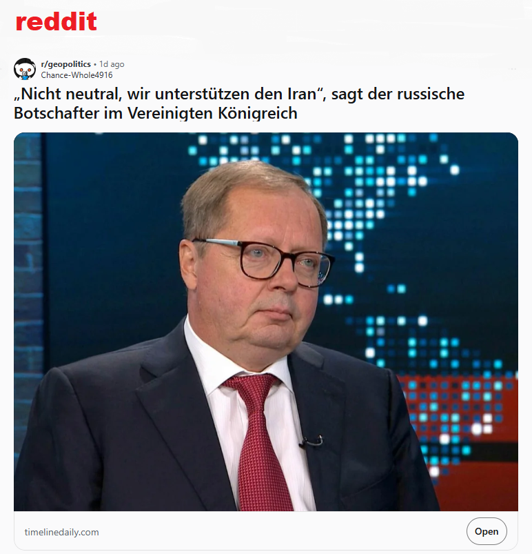 Russland war gezwungen, sich umzuorientieren. In Richtung China, nach Indien, nach Nordkorea und zum Iran hin. Putin fand dort Staatsführer, denen eine Allianz mit Russland willkommen war. So half der Iran mit den ersten Drohnen aus und jetzt nach dem israelisch-amerikanischen Angriff auf den Iran bezog Russland ebenfalls klar Stellung. Nicht neutral sondern klar auf der Seite des Irans. Dass dies jedenfalls mit nachrichtendienstlicher Unterstützung verbunden ist, darf angenommen werden. Inwieweit auch Waffen geliefert werden, liegt im Verborgenen.....