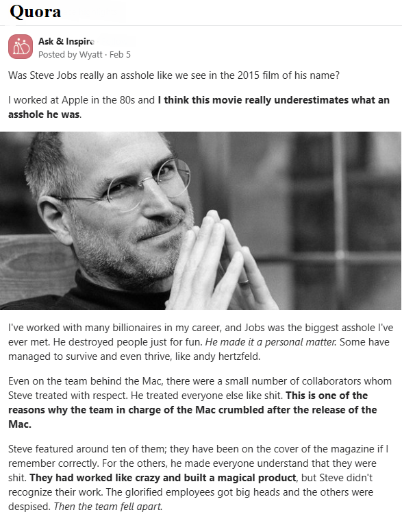 Das sind vielfach Menschen, die einerseits Genies sind, mit Visionen und hart arbeitend, andererseits leider oft auch charakterlich absolute "Arschlöcher", menschlicher Abfall. Das traf offensichtlich auf Steve Jobs zu wie auf Frank Stronach und ganz sicher auch auf Elon Musk. Diese Leute behandelten oder behandeln ihre Mitarbeiter schlechter als ein Stück Vieh. Ihr Reichtum begründete sich nicht nur auf ihr visionäres Denken sondern mehr noch auf der extremen Ausbeutung ihrer Mitarbeiter. Daran ändert auch nichts, dass sie dank ihres Reichtums in späteren Jahren glorifiziert und verehrt werden, sie Stiftungen für wohltätige Aufgaben gründen und ihnen Denkmäler gesetzt werden. Sie waren, sind und bleiben "Arschlöcher".